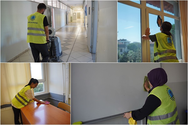 Sadece temizlik değil, aynı zamanda bakım ve onarım çalışmalarına da ağırlık veren belediye, masa, sandalye, koltuk ve dolap gibi eşyaların bakımını ve temizliğini yaparken; okul bahçelerinde çim biçme ve çevre düzenlemeleriyle de eğitim yuvalarını yeni döneme hazırlıyor.