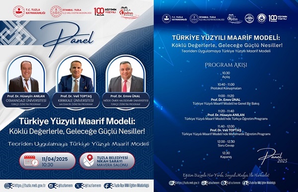 Tuzla İlçe Milli Eğitim Müdürlüğü koordinasyonunda 11 Nisan Cuma günü "Teoriden Uygulamaya: Türkiye Yüzyılı Maarif Modeli Paneli" alanında yetkin akademisyenlerin katılımı ile gerçekleştirilecek.